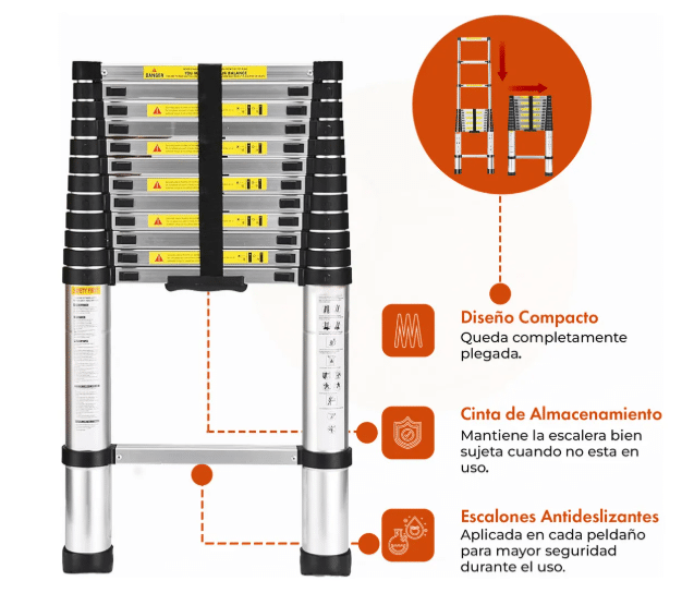 Lo que distingue a la Escalera Telescópica SUPEREFORZADA es su innovador sistema telescópico, que te permite extenderla y retraerla fácilmente a la altura que necesites. Cuando no está en uso, se pliega hasta alcanzar un tamaño compacto que cabe cómodamente en un armario, garaje o incluso en tu vehículo. Olvidate de las escaleras voluminosas que ocupan demasiado espacio: esta escalera está diseñada pensando en la portabilidad y la practicidad.